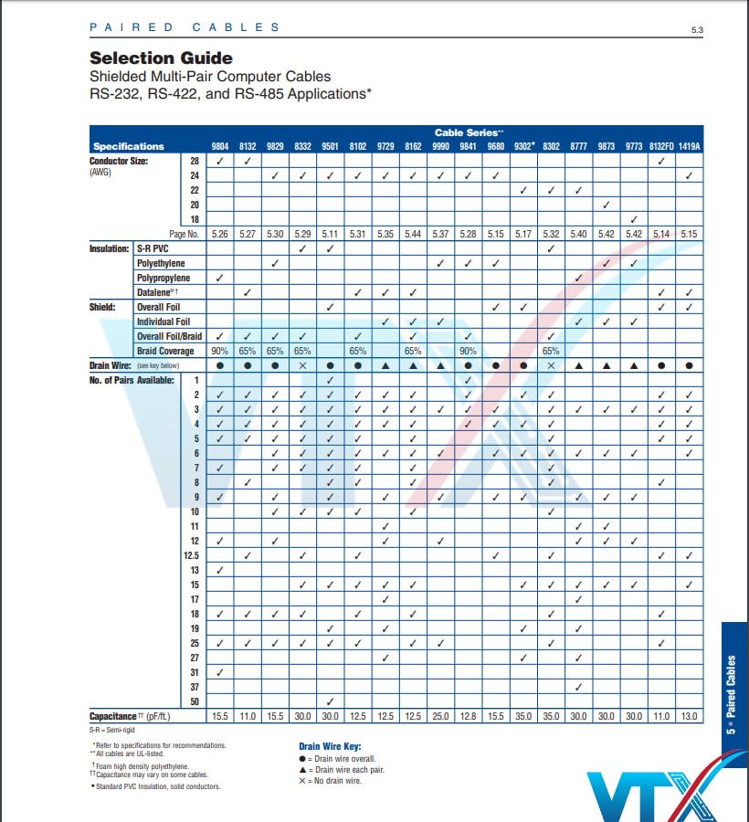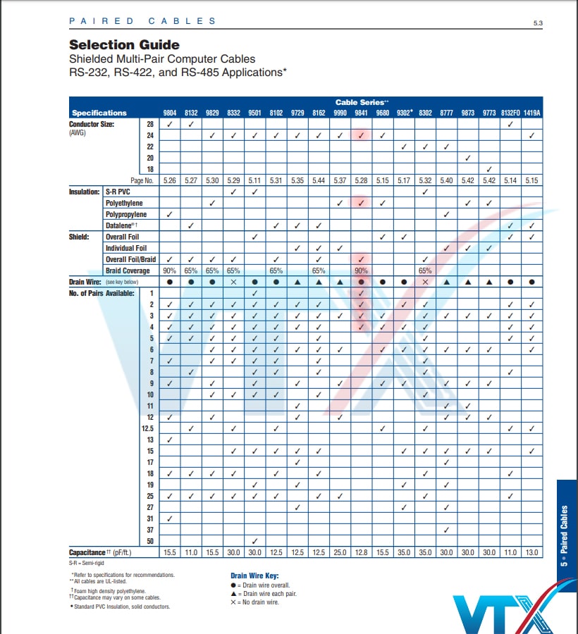 Bảng tổng hợp thông số kỹ thuật của cáp Belden