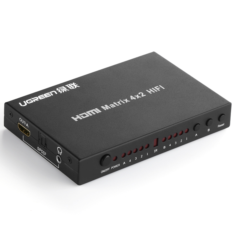 - Bộ chuyển đổi HDMI 4×2 Ugreen 40216 là thiết bị chuyên dụng dùng để kết nối 4 nguồn phát HDMI riêng biệt với 2 màn hình HD, máy chiếu hỗ trợ độ phân giải cao lên đến FullHD 1080P, hỗ trợ trình chiếu 3D… giúp bạn tiết kiệm thời gian, dễ dàng chuyển đổi tín hiệu phát mà không cần thay đổi dây mỗi lần chuyển kênh.