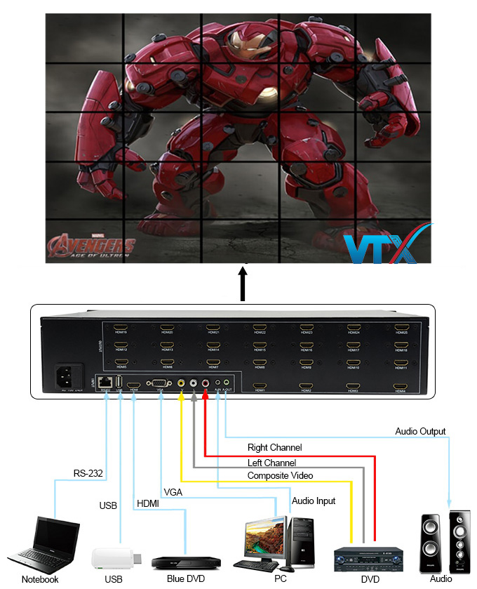 Bộ ghép hỗ trợ 25 màn hình này thường sử dụng ở các nơi có diện tích vô cùng lớn như các showroom, buổi triển lãm quy mô hay các sự kiện âm nhạc ngoài trời phục vụ hàng nghìn khán giả, giúp truyền tải hình ảnh của bạn đến tất cả người xem trong những khôg gian rộng lớn đó.