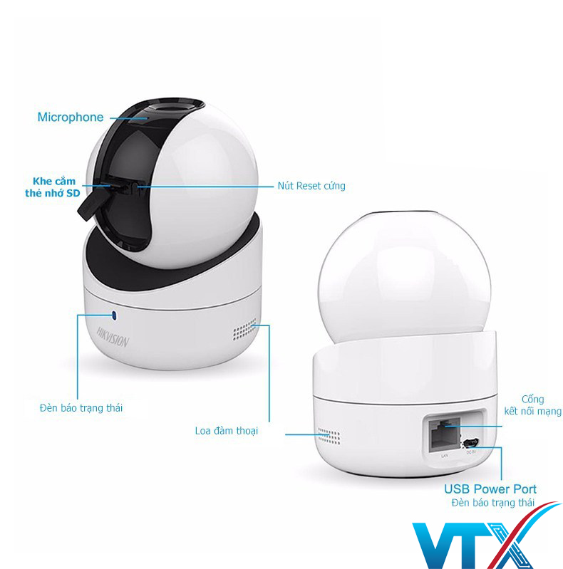 tính năng Pan Tilt (Pan: 0° ~ 355°; Tilt: -10° ~ 90°), hỗ trợ thẻ nhớ lên đến 128gb, dịch vụ HIK-Connect cloud