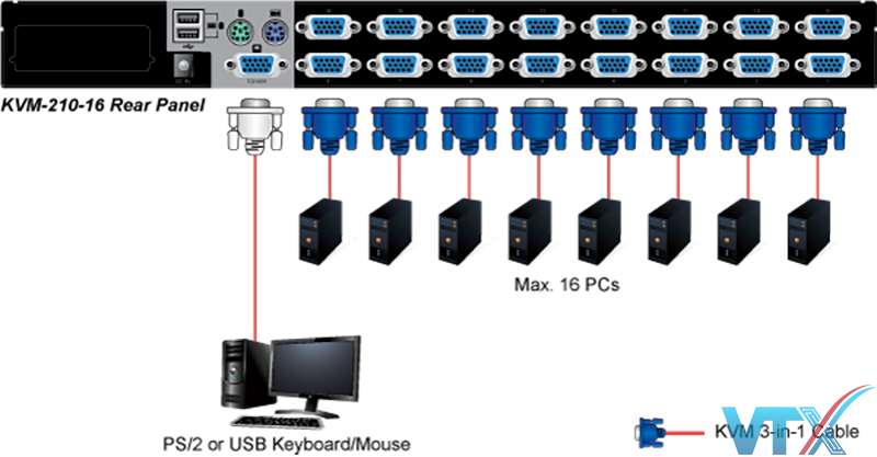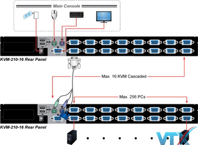 Hoạt động theo tầng: Bằng cách xếp tầng tới các thiết bị chuyển mạch 8/16 KVM, có thể kiểm soát tới 64/256 máy chủ.