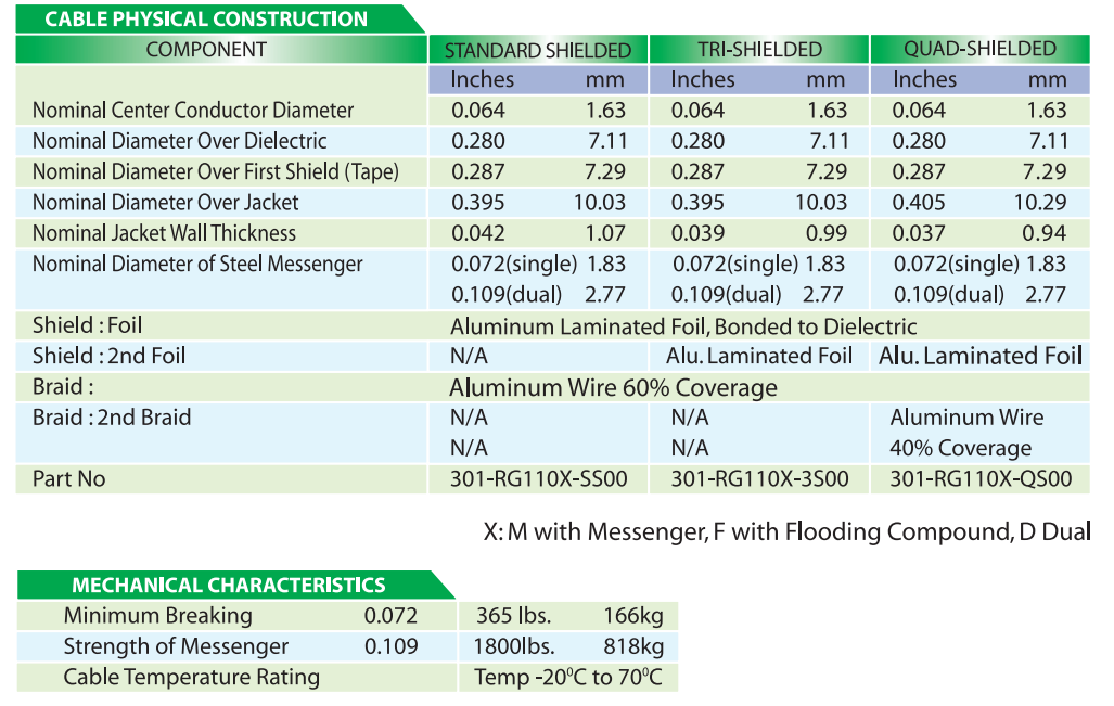 301-RG110M-SSBK-2223 | CATV RG11 Coaxial Cable 75 Ohms, 60% Braid, PE Black, with Messenger, 305m |