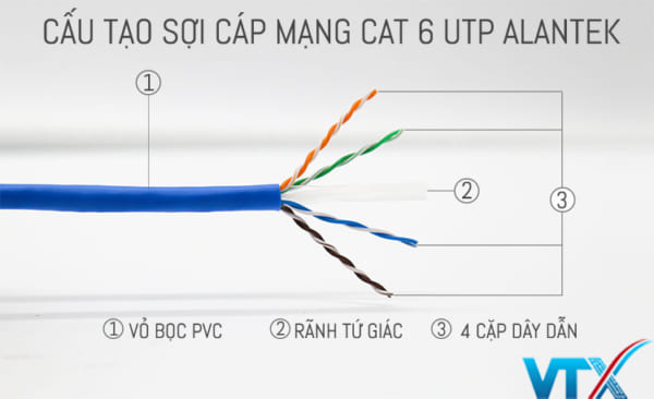 Cáp mạng Alantek Cat6 UTP Bao gồm các thành phần: lõi đồng 23AWG; lõi nhựa chữ thập phân tách 4 cặp dây, lớp vỏ nhựa bảo vệ