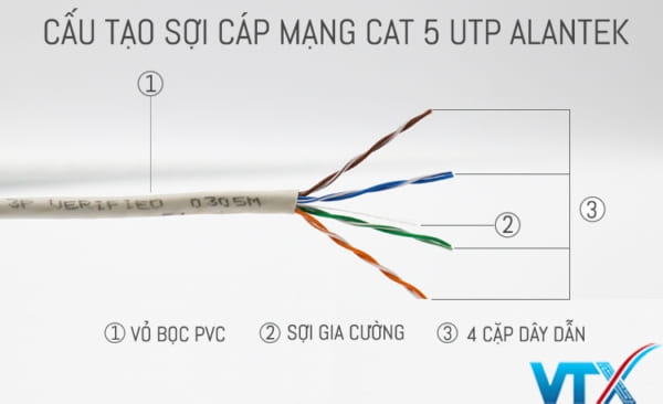 - Vỏ cáp: Dây mạng Alantek cat5 UTP màu trắng xám, được đóng gói dạng pull box, với chiều dài 1000 feet (305m).