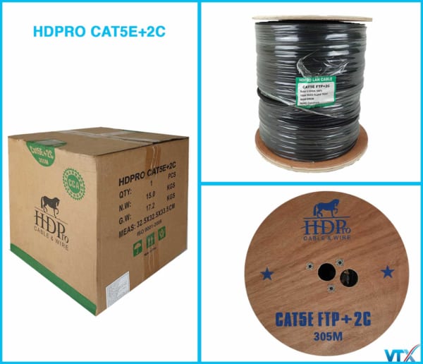 Các sản phẩm của HDpro được sản xuất dựa trên quy trình hiện đại được chuyển giao công nghệ trực tiếp từ Hàn Quốc – Quốc gia có các sản phẩm luôn được đảm bảo về chất lượng đây là thương hiệu chính hãng trực thuộc . Với mô hình nhà máy hiện đại và hệ thống kĩ thuật viên lành nghề, các sản phẩm của HDpro luôn đáp ứng được những tiêu chuẩn khắt khe nhất về chất lượng và đem lại sự hài lòng cao nhất từ phía người tiêu dùng. Cáp mạng kèm nguồn Cat5e FTP + 2C CCA là cáp mạng 8 sợi hợp kim đồng bọc bạc chống nhiễu + 1 sợi đồng gia cường, 1 dây dù trợ lực kèm 2 dây nguồn dẫn điện; loại dây này được dùng rất phổ biến trong các hệ thống camera quan sát, camera IP,… rất tiện lợi cho người sử dụng và giảm thiểu tối đa chi phí cho việc thi công