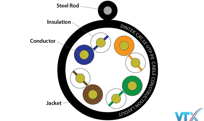 Cáp mạng treo ngoài trời DINTEK CAT5e có cấu tạo vỏ bảo vệ PVC màu đen. cho việc triển khai ngoài trời dễ dàng. Thích hợp sử dụng cho hệ thống mạng, camera, … ngoài trời, những nơi khó thi công.
