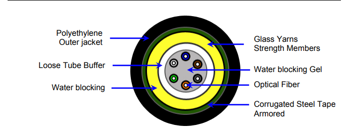 - -Cấu trúc dạng ống đơn (single loose tube) sẽ có một ống buffer bên trong sợi cáp, với lớp hợp chất chống thấm nước dạng khô, cùng với một dải thép gấp nếp (loại bọc thép) và lớp vỏ bằng chất polyethylene (MDPE) bên ngoài. Cấu trúc đường kính single loose tube nhỏ tiết kiệm không gian bên trong ống dẫn.