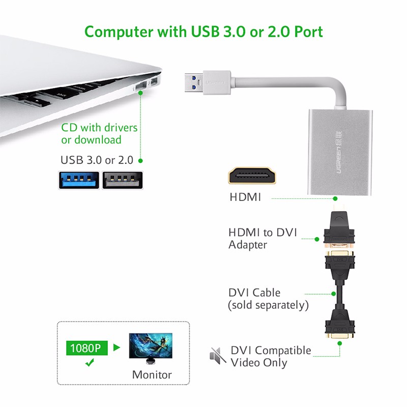 - Cáp chuyển đổi USB 3.0 to HDMI Ugreen UG-40229 là sản phẩm tiện ích cho máy chiếu, màn hình LCD thông qua cổng USB 3.0 của máy tính. Cho độ phân giải lên đến 2048x 1152 (32 bit mầu). Tương thích cả với những chuẩn HDMI 1.2 thậm chí là 1.1.