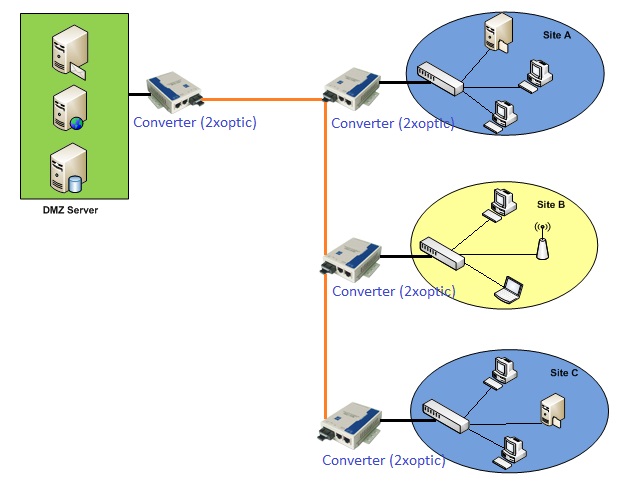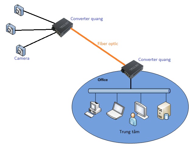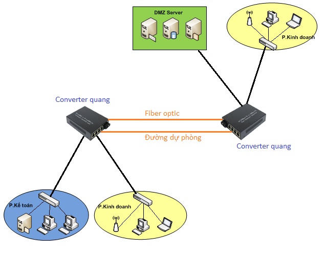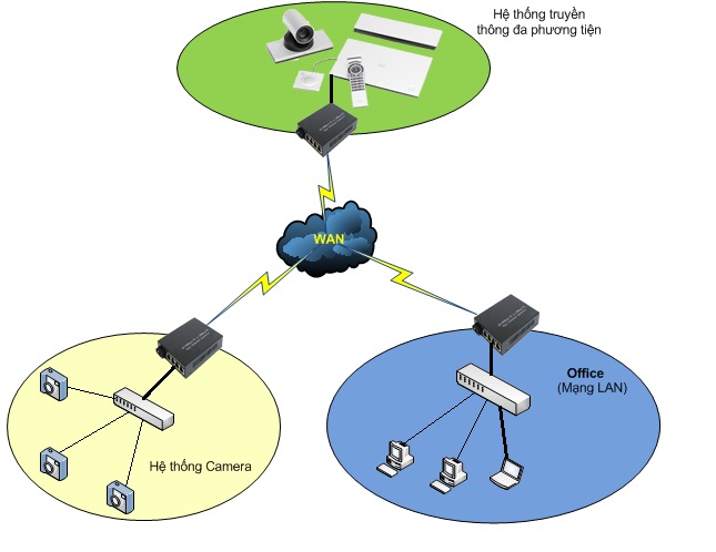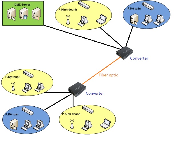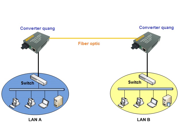 Kết nối 2 hoặc nhiều mạng nội bộ (LAN), sử dụng converter quang điện trên nền cáp quang