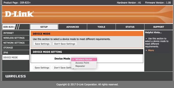 Để thay đổi các chế độ giữa Wireless Router/Access Point/Repeater(WiFi Extender) sẽ nằm trong mục Device Mode, bạn có thể chọn chế độ bạn cần và sau đó router sẽ khởi động lại để thay đổi thiết lập.