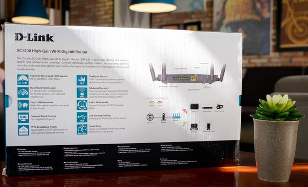 Như các bạn đã thấy mọi thông tin tính năng từ router D-Link DIR-825+ đều được hiển thị bên ngoài vỏ hộp, với điểm nhấn chính hỗ trợ anten 4x7dBi, độ lợi sóng cao, khả năng phủ sóng ổn định rộng khắp khu vực văn phòng/căn hộ nhỏ, điều mà các một số router khác trong cùng tầm giá hoặc rẻ hơn gần như không được trang bị vì anten 7dBi cần phải được hỗ trợ nguồn công suất cao hơn.