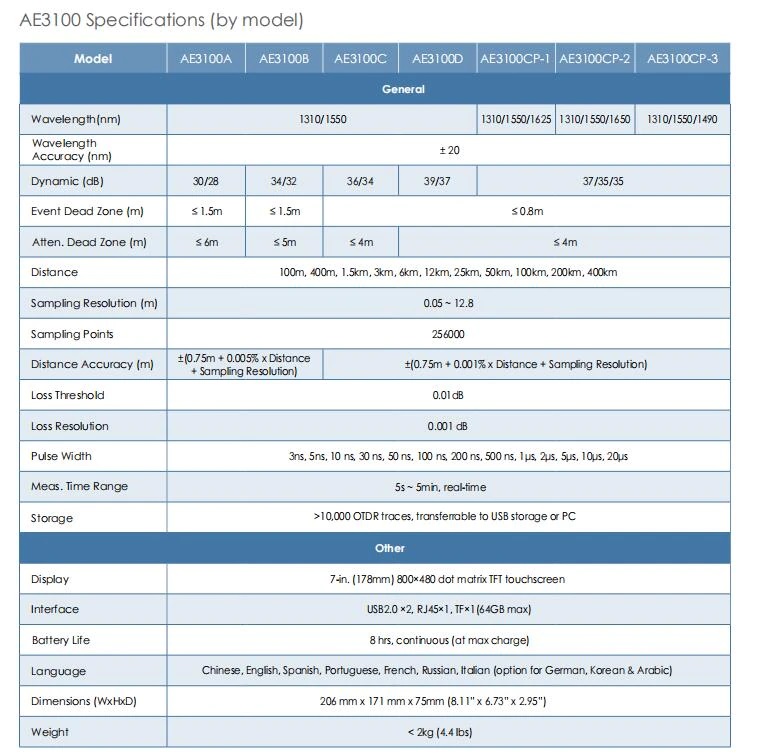 Thông số kỹ thuật Máy đo OTDR Deviser AE3100A