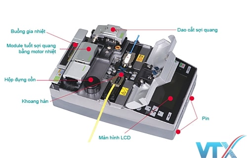 - Các tính năng: Máy hàn cáp quang, tuốt sợi quang, cắt sợi quang, vệ sinh sợi quang và gia nhiệt mối hàn