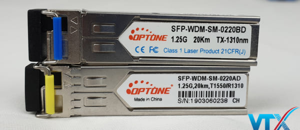 Module quang Optone là loại module với chất lượng bền, đẹp, ưu điểm của hãng là có mức giá vô cùng cạnh tranh so với các loại module khác. Sản phẩm Module Quang Optone 1 sợi SFP-WDM-SM-0220AD/BD sử dụng 1 sợi quang để truyền tín hiệu nên rất tiện kiệm về mặt chi phí dây. Đây là sản phẩm của hãng Optone, bảo hành 1 năm chính hãng, tương thích với hầu hết các thiết bị swtich CiLCo, HP.. và các loại switch quang khác.