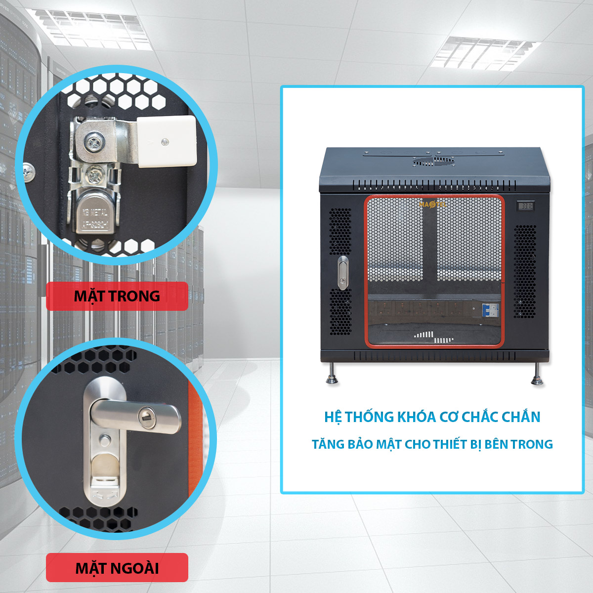 - Tủ trang bị thanh đỡ theo tiêu chuẩn 19 inch (48,26 cm) có đánh số, tương thích với nhiều loại thiết bị mạng và đảm bảo lắp đặt dễ dàng, chính xác.