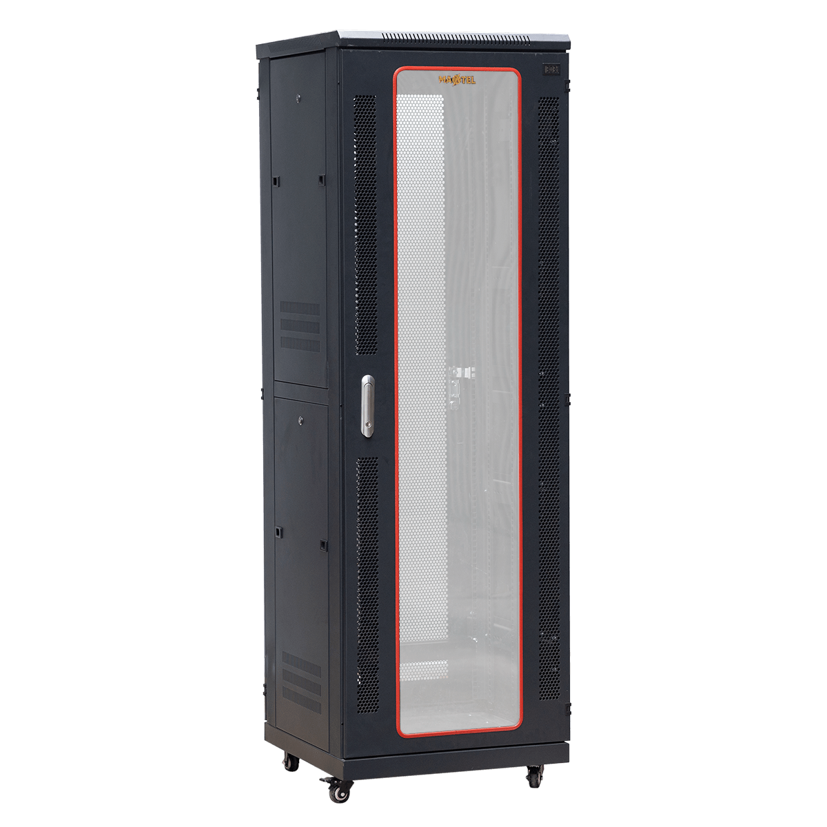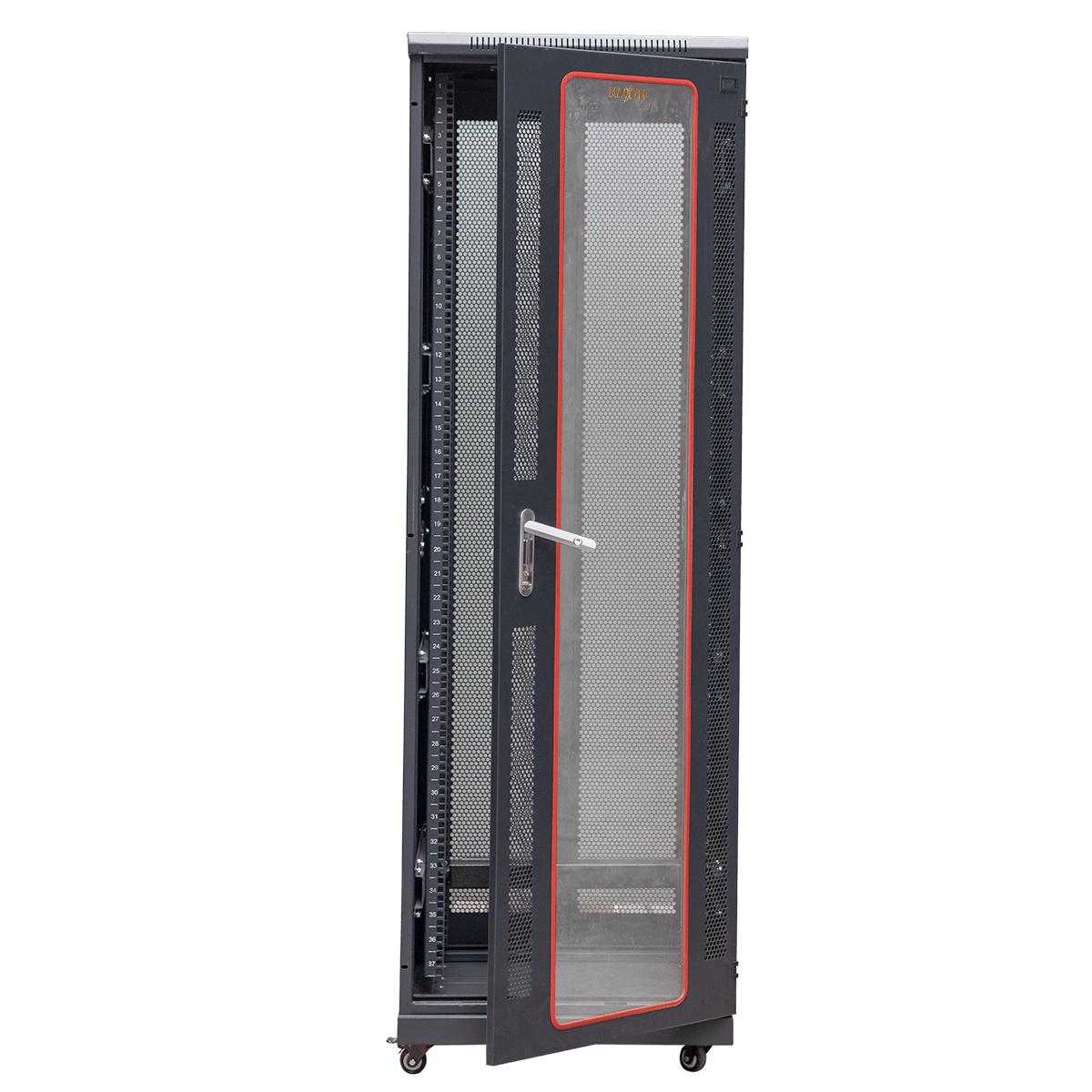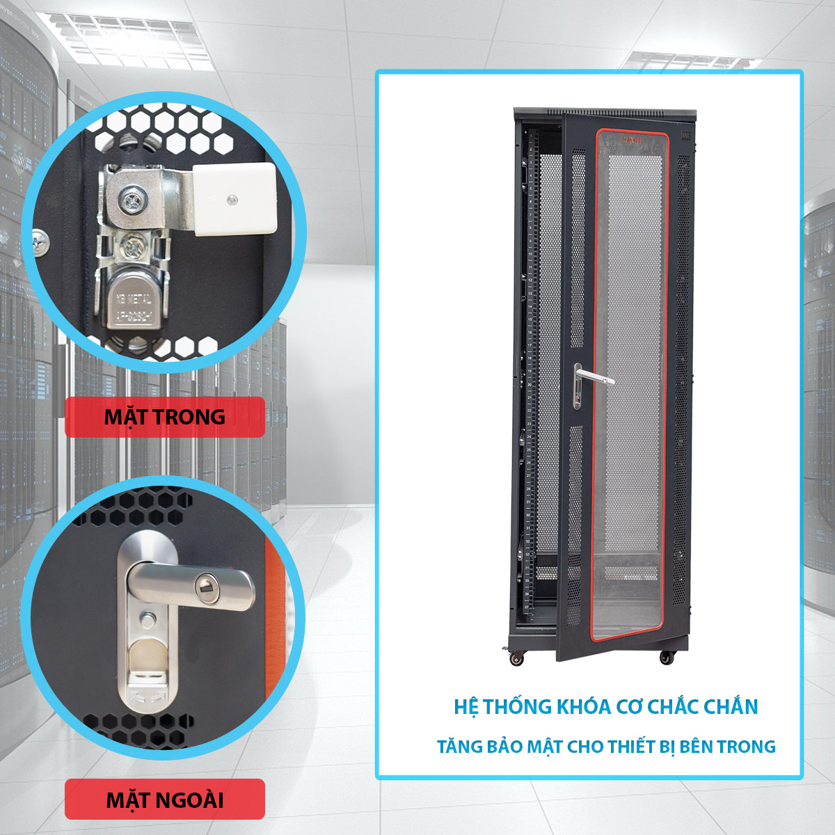 - Thiết kế cửa trước của tủ rack sử dụng kính hoặc mica trong suốt, cho phép quan sát bên trong dễ dàng mà không cần mở cửa, giúp kiểm tra trạng thái hoạt động của các thiết bị mạng mà không gián đoạn hệ thống. Điều này rất hữu ích trong môi trường yêu cầu sự kiểm soát chặt chẽ như phòng máy chủ hay trung tâm dữ liệu.