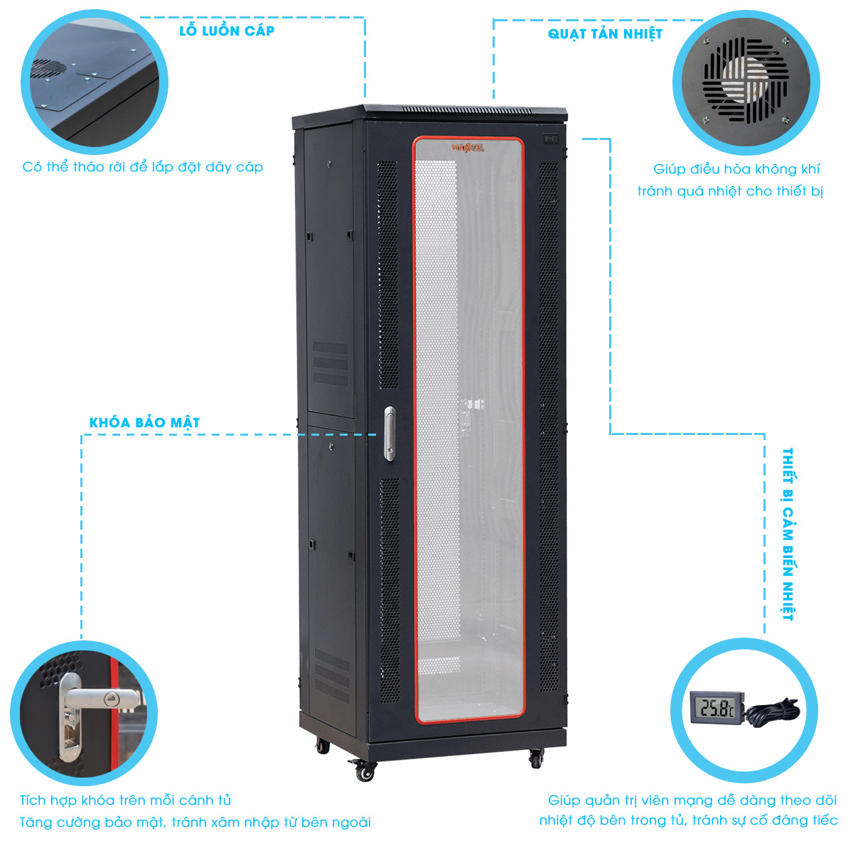Sản phẩm giúp sắp xếp, quản lý các thiết bị mạng như máy chủ, switch, router, và hệ thống lưu trữ dữ liệu một cách ngăn nắp, đồng thời bảo vệ chúng khỏi các yếu tố môi trường như bụi bẩn, va đập, đảm bảo an toàn và ổn định cho hệ thống mạng.