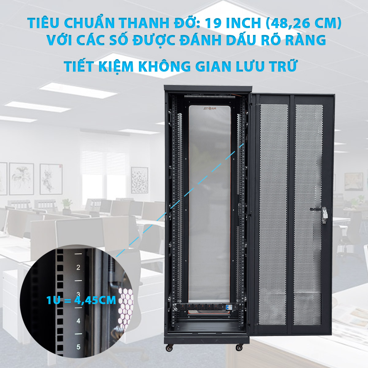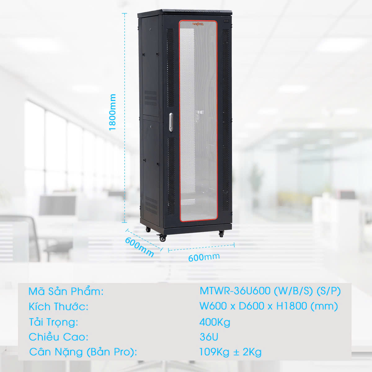 - Với kích thước W600xD600xH1535mm (W24″xD24″xH67″), tủ rack 36U Maxtel MTR-36U600 mang đến không gian lưu trữ rộng rãi phù hợp với các thiết bị mạng tiêu chuẩn 19 inch (48,26cm).