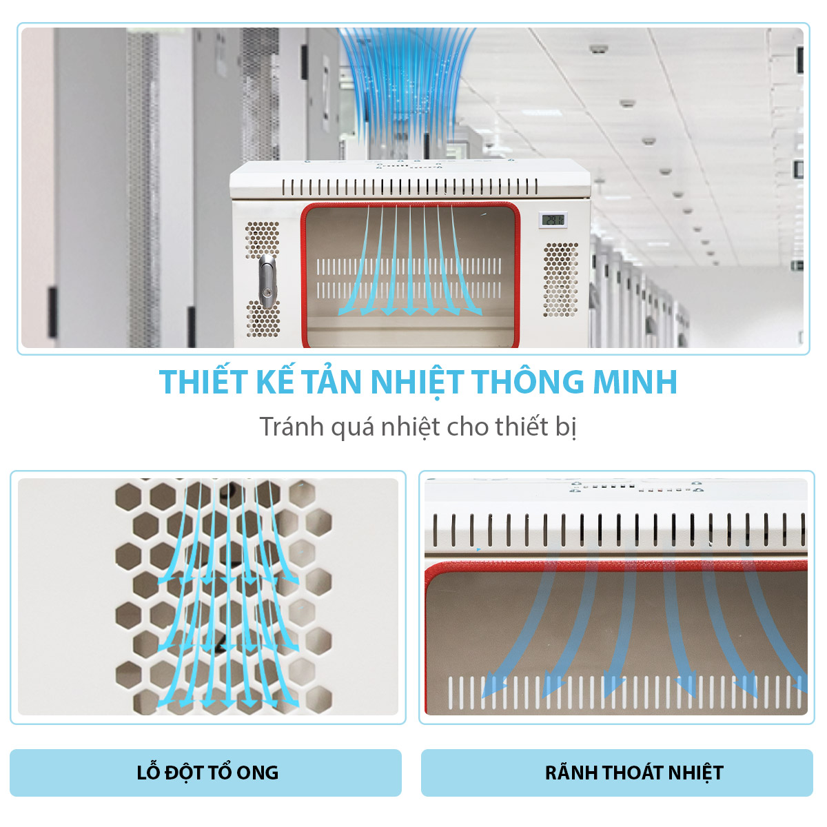 - Tủ được trang bị 1 quạt gió trên đỉnh, giúp tối ưu hóa khả năng làm mát cho các thiết bị bên trong. Kết hợp với cảm biến nhiệt độ và dây tiếp địa chống rò điện, MTR-6U400(W/B/S) (S/P) đảm bảo thiết bị luôn hoạt động ổn định và an toàn trong mọi điều kiện.