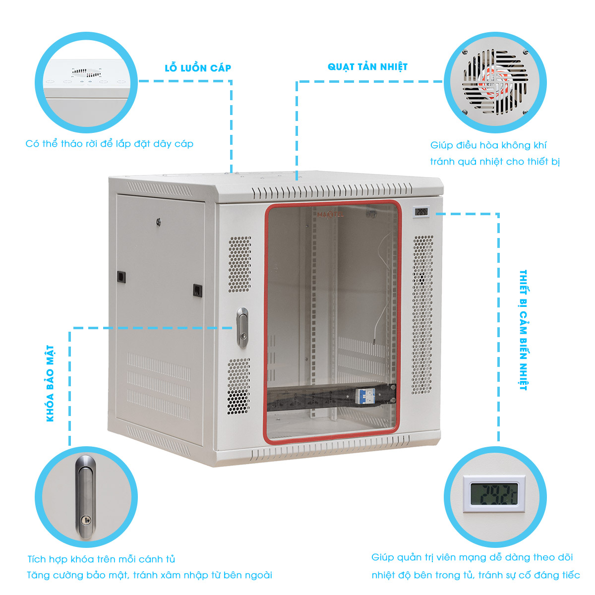 - Với một đường nắp vào/ra ở nóc và một ở đáy, tủ cho phép quản lý nắp gọn gàng, giúp duy trì không gian bên trong sạch sẽ và sắp xếp các thiết bị gọn gàng. Ngoài ra, tủ cũng được trang bị quạt gió trên đỉnh, giúp thoát nhiệt hiệu quả, bảo vệ các thiết bị khỏi tình trạng quá nhiệt, hạn chế sự cố xảy ra.