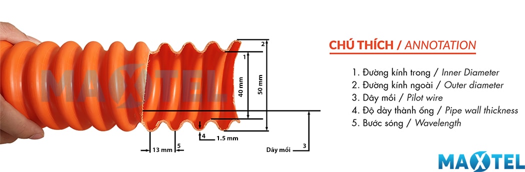 Đặc điểm cấu tạo của ống nhựa gân xoắn 40/50 Maxtel