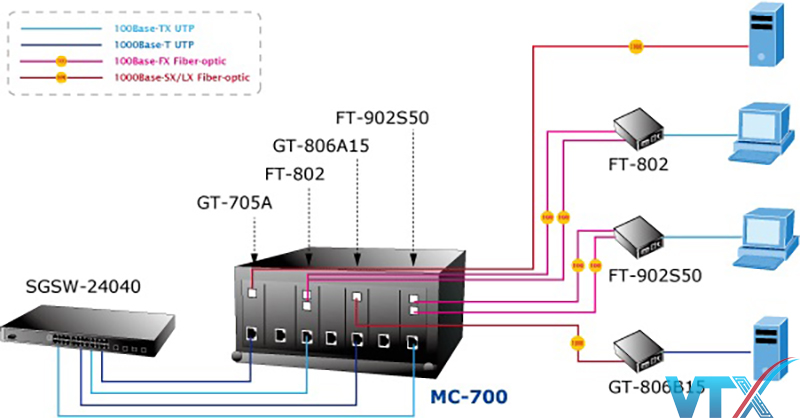 Để đáp ứng như cầu ngày càng tăng đối với hệ thống mạng hiện tại, PLANET MC-700 cung cấp công nghệ chuyển đổi đa phương tiện tiên tiến. Khung chuyển đổi phương tiện truyền thông cho phép cài đặt tối đa bảy bộ chuyển đổi phương tiện Ethernet nhanh/Gigabit Ethernet của PLANET FT-8/GT-7/GT-8 với các tùy chọn đa dạng về loại kết nối sợi để phù hợp với các ứng dụng mạng khác nhau. Dòng FT-8/FT-9/GT-7/GT-8 rất linh hoạt khi được cài đặt trong MC-700 để cung cấp năng lượng tập trung và quản lý chuyển đổi phương tiện.