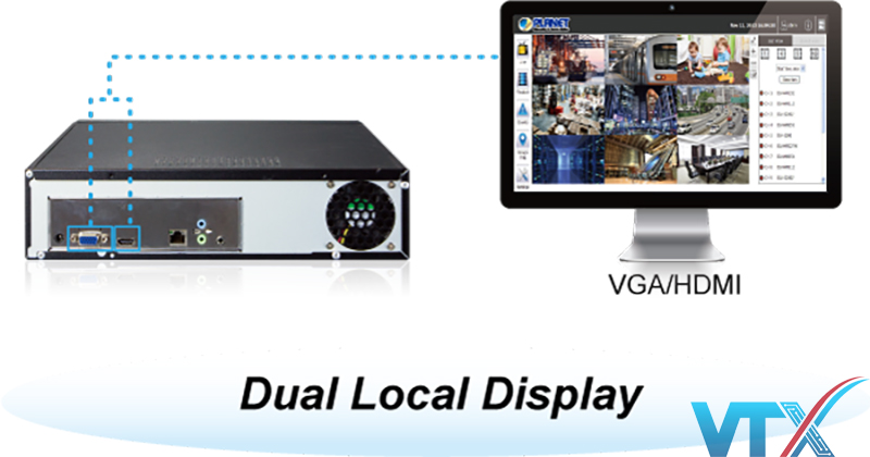 NVR-820 cung cấp giao diện đầu ra video HDMI và VGA cho màn hình cục bộ kép, có thể được kết nối với màn hình HDMI hoặc TV để thực hiện giám sát ở độ phân giải full HD (1920×1080) và kiểm tra trạng thái hệ thống NVR trên màn hình VGA cùng lúc.