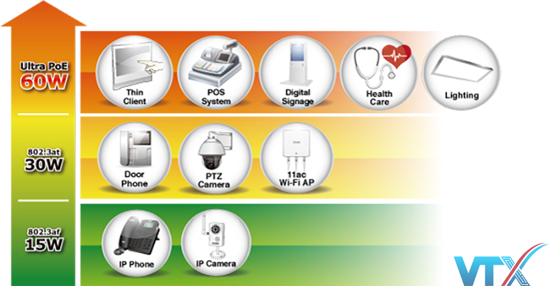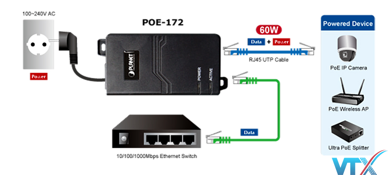 Vì tiêu chuẩn IEEE 802.3at/af PoE, POE-172 có thể kết nối trực tiếp với bất kỳ nút cuối nào của IEEE 802.3at/af như camera mạng tốc độ PTZ (Pan, Tilt&Zoom), color touch-screen Voice over IP (VoIP) telephones và các điểm truy cập mạng LAN không dây đa kênh.