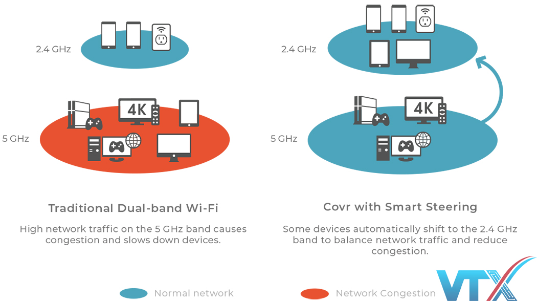 Steering thông minh chọn băng tần tốt nhất để thiết bị có được hiệu suất tốt nhất có thể. Với hệ thống thông minh này, Router COVR-1203/ESG sẽ tự động kết nối các thiết bị với băng tần Wi-Fi tối ưu và thậm chí di chuyển các thiết bị giữa các băng tần Wi-Fi khi mạng gặp sự cố tắc nghẽn.