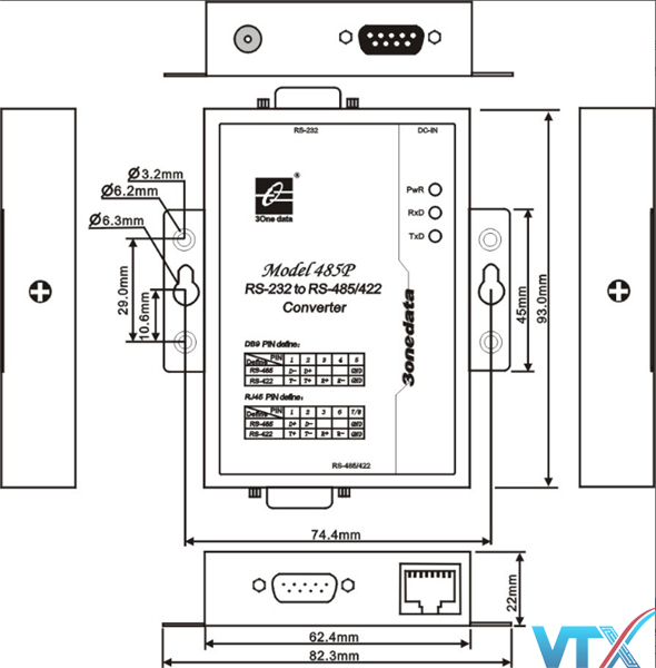 Thông số kỹ thuật Bộ chuyển đổi RS232 sang RS485 3Onedata Model 485P