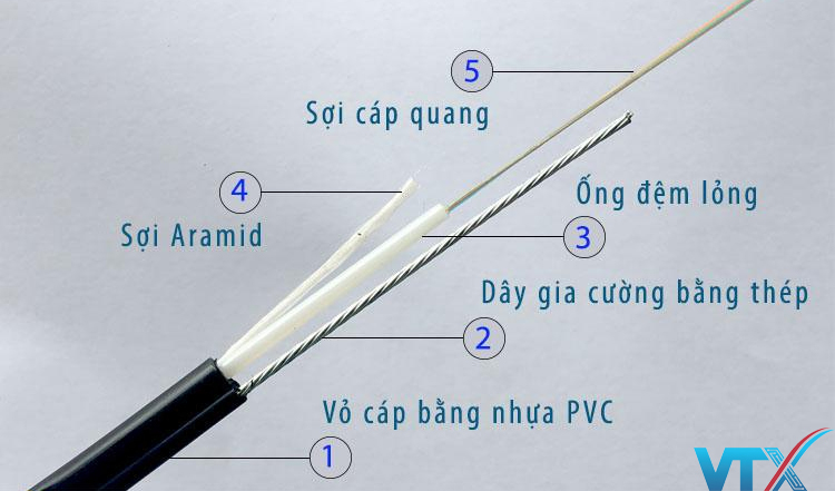 Cáp quang 2 core có cấu trúc dạng hình số 8, có dây thép gia cường; sử dụng được cả trong nhà lẫn ngoài trời, cáp có thể dùng treo, kéo cống đều được.