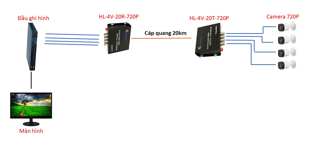 Converter video quang GNETCOM 4 kênh HL-4V-20T/R-720P cho camera AHD/CVI/TVI.
