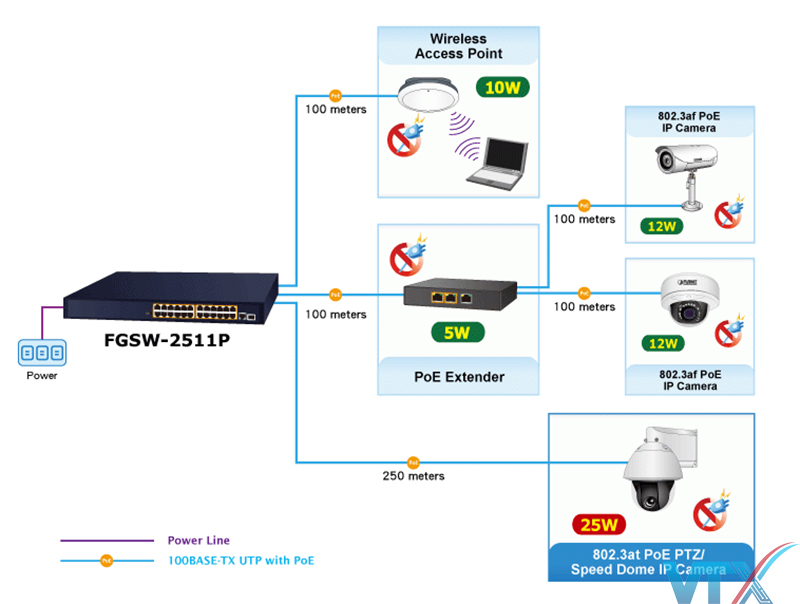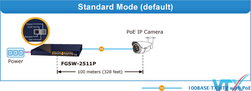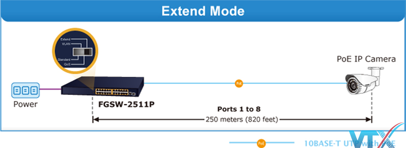 Dạ Từ cổng 1 đến cổng 8 của FGSW-2511P có thể hỗ trợ công suất PoE 25watt trong khoảng cách lên tới 250 mét vượt qua giới hạn 100m trên cáp Ethernet UTP ạ!