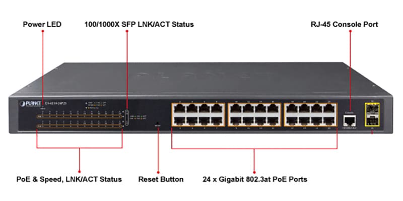 Nếu bạn đang tìm kiếm switch 24 port PoE mạnh mẽ để phát triển hệ thống IP camera, điểm truy cập Wi-Fi hoặc điện thoại VoIP thì PLANET GS-4210-24P2S chính là lựa chọn hàng đầu.