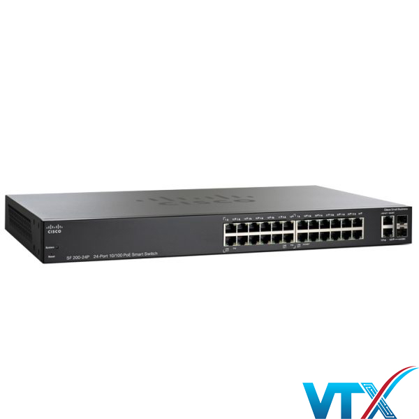Switch chia mạng Cisco 24Port SF200-24 thuộc dòng sản phẩm Cisco small business 200 Series dành cho doanh nghiệp nhỏ và vừa. Bộ chia mạng được thiết kế để hoạt động ở layer 2 trong mô hình mạng OSI, cung cấp 24 10/100 ports, cộng thêm 2 cổng mini-GBIC cho các kết nối LAN. Chúng ta có thể sử dụng Switch Cisco để kết nối các máy tính, máy in, camera hoăc các Thiết bị wifi diện rộng Unifi trong 1 phòng ban, trong các doanh nghiệp nhỏ với số lượng user ít… và sử dụng để mở rộng mạng LAN trong các doanh nghiệp.