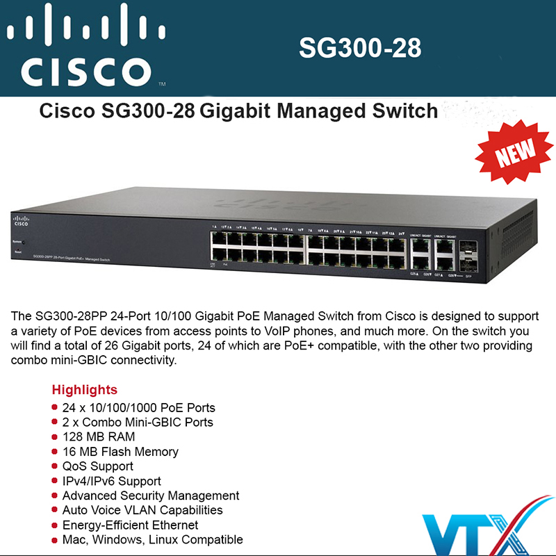 - Cisco 28Port 10/100/1000Mbps – Cisco SG300-28 mang hiệu suất mà cao để chạy các ứng dụng viễn thông, bao gồm cả các dịch vụ video băng thông. Nâng cao công suất và hiệu suất truyền tải, cho phép bạn chuyển các tập tin lớn trong vài giây