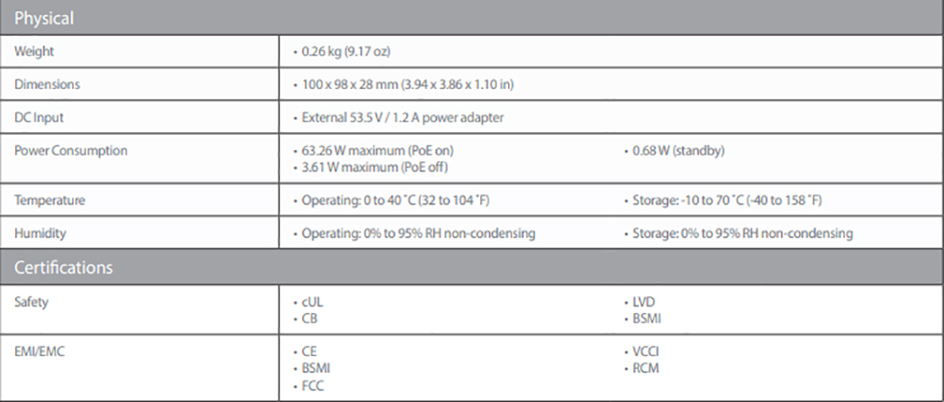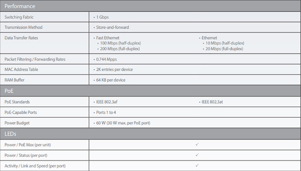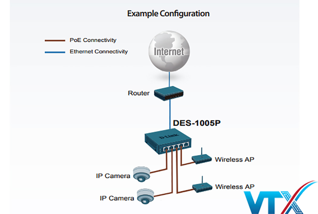 DES-1005P có bốn cổng 10 / 100BASE-T hỗ trợ các giao thức PoE của IEEE 802.3af và IEEE 802.3at, cung cấp tới 30 W trên mỗi cổng PoE và cung cấp tổng ngân sách năng lượng là 60 W. Bạn có thể kết nối các thiết bị tương thích với DES-1005P mà không cần sử dụng nguồn điện bổ sung. Điều này cho phép bạn tiết kiệm hệ thống cáp và cài đặt thiết bị ở các vị trí mà không cần truy cập ngay vào ổ cắm điện.