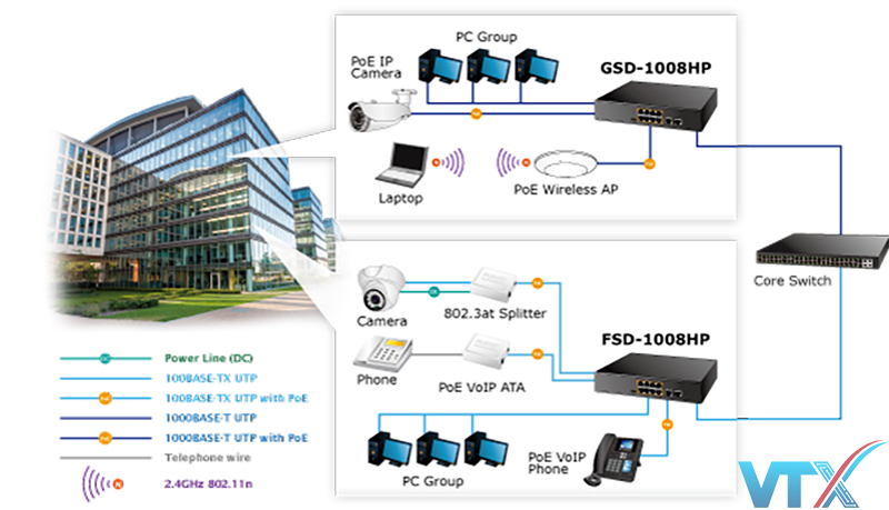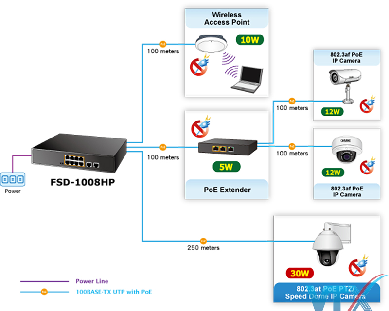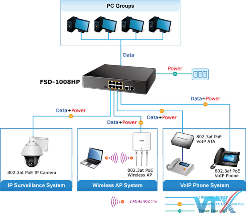 Dễ dàng xây dựng một nguồn năng lượng điều khiển tập trung các hệ thống điện thoại IP, hệ thống camera IP và hệ thống AP không dây cho doanh nghiệp, bằng việc sử dụng thiết bị FSD-1008HP. Ví dụ như có thể lắp đặt tối đa 8 camera quanh công ty cho các nhu cầu giám sát hoặc có thể xây dựng tối đa 8 AP không dây để có môi trường chuyển vùng không dây trong văn phòng. Không có giới hạn ổ cắm điện, FSD-1008HP giúp cho việc lắp đặt camera hoặc AP không dây dễ dàng và hiệu quả hơn.