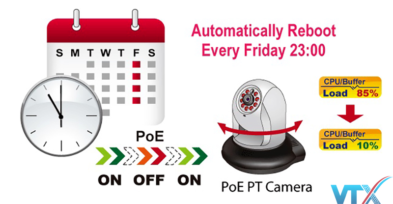 Switch này cho phép các camera IP PoE hoặc điểm truy cập không dây PoE khởi động lại vào một thời điểm nhất định mỗi tuần. Từ đó sẽ giảm thiểu khả năng tràn bộ đệm cho IP và AP