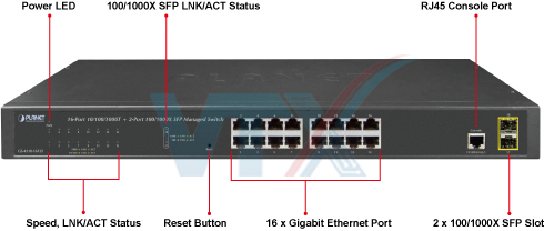 - 16 cổng RJ45 10/100/1000BASE-T + 2 slot 100/1000BASE-X SFP.