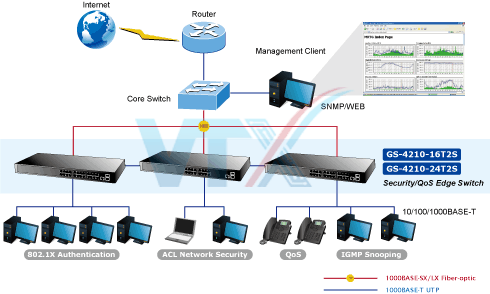 Switch chia mạng PLANET GS-4210-16T2S+2Port 100/1000BASE-X hỗ trợ cổng RJ45 10/100/1000BASE-T + 2 slot 100/1000BASE-X SFP. thiết bị đạt tốc độ tối ưu khi truyền qua các loại cáp RJ-45 Cat5e/Cat6. Sự hỗ trợ này là chuẩn đối với Auto-MDI/MDI-X, switch có thể tìm ra loại kết nối tới bất kỳ loại thiết bị mạng Ethernet nào mà không cần đến loại cáp thẳng hay cáp chéo.