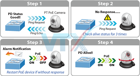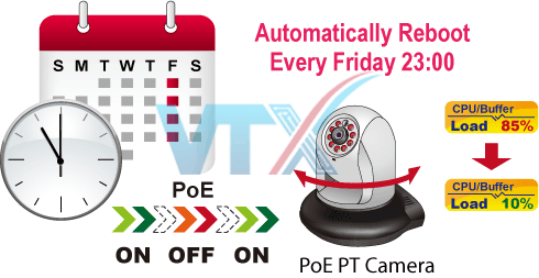 khi PLANET cho phép mỗi một kết nối PoE như IP camera hoặc Wireless Access point sẽ được tự khởi động lại theo thời gian đặc biệt. Vì vậy nó sẽ làm giảm việc bị tràn bộ nhớ đệm cho camera hoặc Access Point