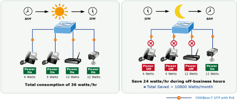 Trên toàn thế giới hiện nay có xu hướng tiết kiệm năng lượng và bảo vệ môi trường, PLANET GS-4210-8P2S có thể quản lý hiệu quả nguồn cấp PoE có khả năng cấp mức công suất cao. Việc lập lịch PoE giúp cho việc tắt hoặc bật tính năng nguồn nuôi PoE theo thời gian đặc biệt giúp cho các môi trường doanh nghiệp vừa và nhỏ tiết kiệm chi phí và điện năng. Ngoài ra thiết bị cũng tăng bảo mật bằng cách tắt nguồn PoE trong giờ hành chính.