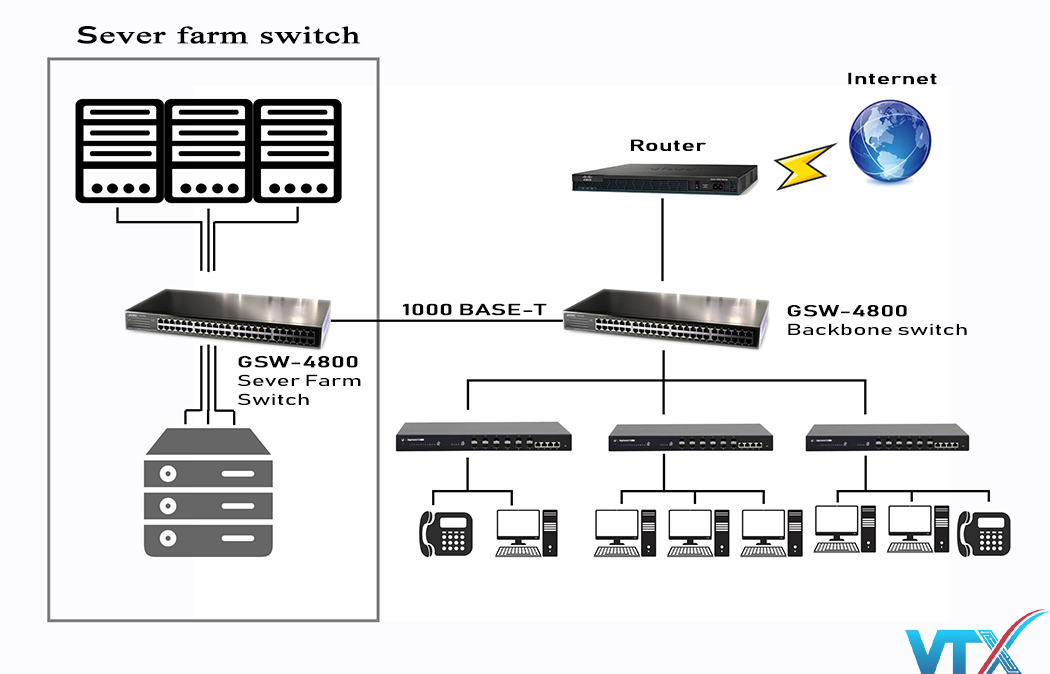 Switch chia mạng Plannet GSW-4800 48Port 10/100/1000BASE-T là một thiết bị không thể thiếu ở các cơ sở hạ tầng, văn phòng … dùng để kết nối các đoạn mạng với nhau theo mô hình mạng hình sao (Star). Theo mô hình này, thiết bị đóng vai trò là switch trung tâm, tất cả các máy tính đều được nối về đây trong một hệ thống mạng.