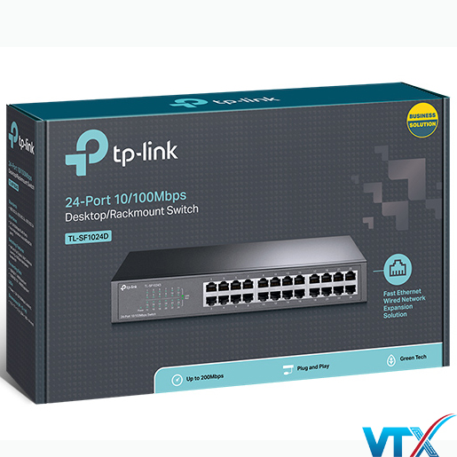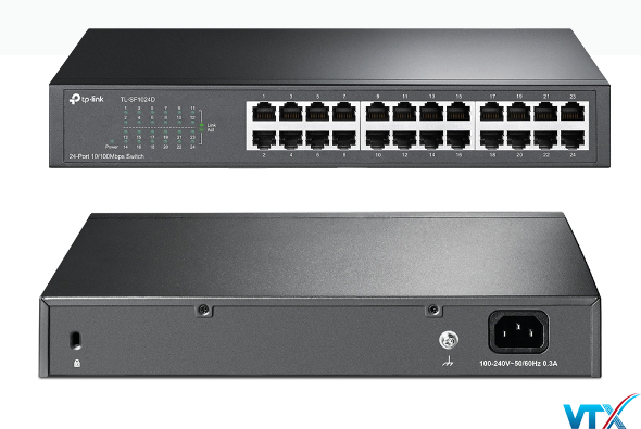 Switch chia mạng TP Link 10/100Mbps 24-cổng là bộ chia tín hiệu Ethernet mang đến cho bạn một hiệu suất cao với giá thành tiết kiệm, dễ sử dụng, nâng cấp theo tiêu chuẩn một cách mượt mà qua đó có thể cải thiện hệ thống mạng của bạn thành hệ thống mạng với tốc độ 1000Mbps. Nó bảo gồm 24 cổng này đều hỗ trợ tính năng auto-MDI/MDIX, giúp bạn không còn lo lắng về vấn đề dây cáp lằng nhằng, chỉ cần cắm vào là xài.