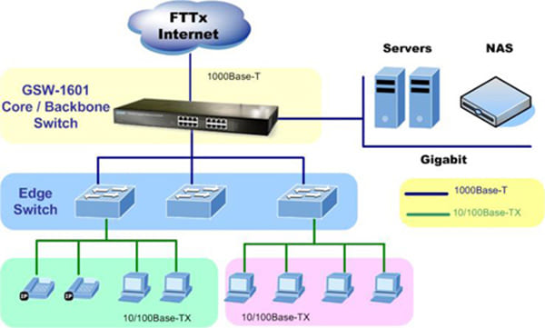 Có 16 cổng Gigabit Ethernet, Switch GSW-1601 là lý tưởng để sử dụng như một server farm switch khi kết nối tới các server và các máy desktop.