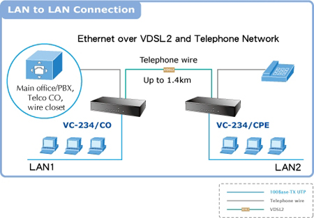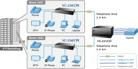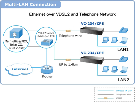 Thiết bị là một giải pháp hoàn hảo cho việc sử dụng để mở rộng mạng Ethernet từ hệ thống mạng hiện có. PLANET VC-234 có 4 cổng Ethernet RJ-45 và 2 côngr RJ-11 cho đường dây điện thoại, trong đó 1 cổng RJ-11 cho kết nối VDSL và cổng RJ-11 còn lại cho kết nối POTS.