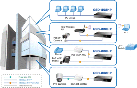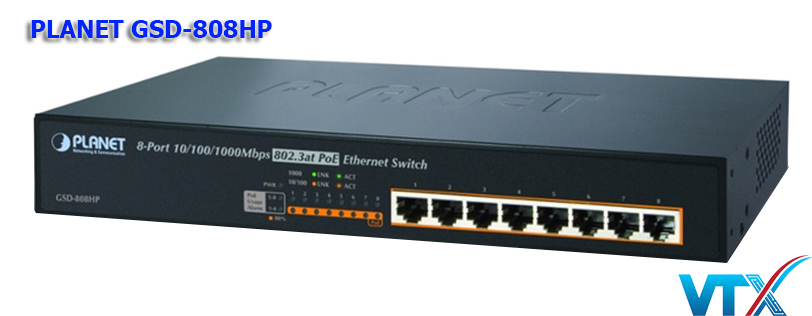 Planet giới thiệu ra thị trường dòng thiết bị Switch mạng PoE PLANET GSD-808HP. Thiết bị hỗ trợ 8 cổng 10/100/1000 Mbps có tính cấp nguồn PoE trong kiến trúc 13 inch, chuẩn để bàn với lớp vỏ bằng kim loại.Các cổng chuyển mạch trên thiết bị hỗ trợ cấp nguồn PoE với công suất tối đa tới 30W và sử dụng cáp Cat5E/Cat6 hỗ trợ cấp nguồn PoE lớn gấp 2 lần so với chuẩn 802.3af hiện nay.