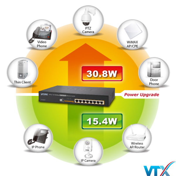 - Hỗ trợ cấp nguồn cho 8 thiết bị PoE chuẩn 802.3af và 802.3at