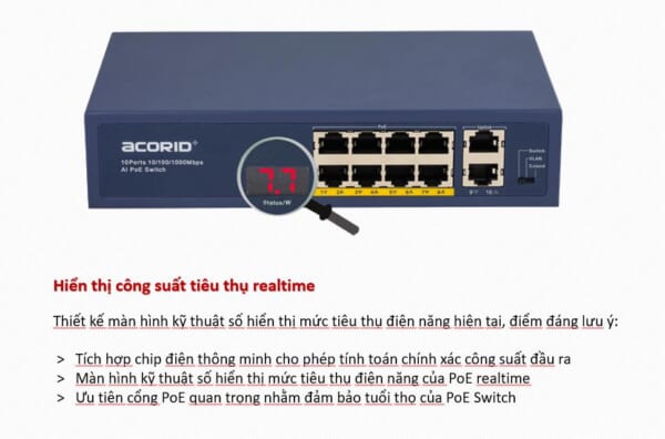 Switch chia mạng Acorid LS1716P2G là Switch chia mạng dạng unmanaged với 16 cổng PoE 10 / 100Mbps và 2 cổng Uplink Gigabit Rj45 10 / 100Mbps. Thiết bị còn được chức năng quản lý nguồn PoE Step-link giúp tính toán chính xác mức tiêu thụ điện PoE. Đặc biệt, trong trường hợp tổng nguồn điện của tất cả các cổng PoE vượt quá mức cấp nguồn tối đa (PoE Budget), cổng PoE ưu tiên được kích hoạt bởi Step-link, ngắt kết nối nguồn điện cổng có dộ ưu tiên thấp hơn, đảm bảo cấp nguồn cho thiết bị PD quan trọng, kéo dài tuổi thọ của thiết bị switch cũng như tiện lợi hơn rất nhiều cho các nhà quản trị mạng.
